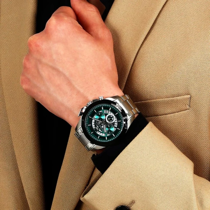 Elegancki zegarek męski z chronografem i datownikiem, wodoszczelny.