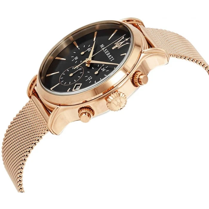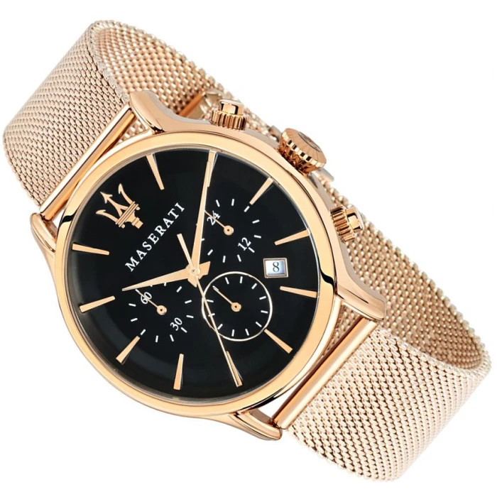 Model MASERATI EPOCA R8873618005 napędzany jest za pomocą mechanizmu kwarcowego Koperta wykonana z hipoalergicznej stali szlachetnej złoconej trwałą metodą PVD (różowe złoto), która nie koroduje i nie uczula została umieszczona na bransolecie typu mesh. Czarna tarcza czasomierza chroniona jest, odpornym na stłuczenia, mineralnym szkiełkiem. Niewątpliwie do zalet zegarka możemy zaliczyć datownik zlokalizowany pomiędzy godziną 4 a 5, stoper w formie chronografu odmierzający czas do 60 minut, oraz tarcze 24-godzinną wskazującą aktualną porę dnia. Wodoszczelność na poziomie 10ATM (100m) pozwala na zanurzenie w wodzie i swobodne pływanie.