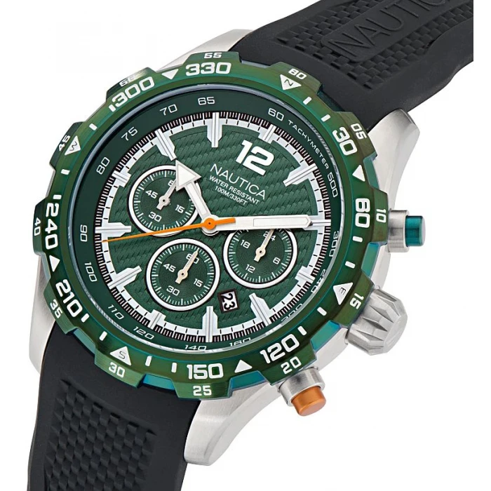 Zegarek amerykańskiej firmy Nautica NAPNSS407 ze sportowej kolekcji One Chronograph. Wodoszczelny, ze skalą tachometru, stoperem i datownikiem oraz ciekawie fakturowaną zieloną tarczą, której dodatkowo dynamiki dodaje pomarańczowy sekundnik. Funkcjonalny ale i modny dodatek dla aktywnego mężczyzny.