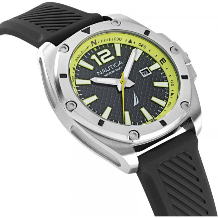 Model NAUTICA NAPTCS222 TIN CAN BAY umożliwia odczyt w tradycyjny sposób, czyli za pomocą mechanizmu wskazówkowego. Neobrite to specjalna powłoka luminescencyjna,w którą został wyposażony czasomierz, pozwala na odczyt w ciemności. Na godzinie 3.00 znajduje się datownik wskazujący aktualny dzień miesiąca. Przydatną funkcją jest skala kompasu, w którą projektanci zgrabnie wyposażyli zegarek. Warto zwrócić uwagę na ciekawy design, mianowicie na odsłonięte śruby oraz detale w kontrastowych kolorach. Dodatek ten nadaje całości wyróżniający się wygląd.