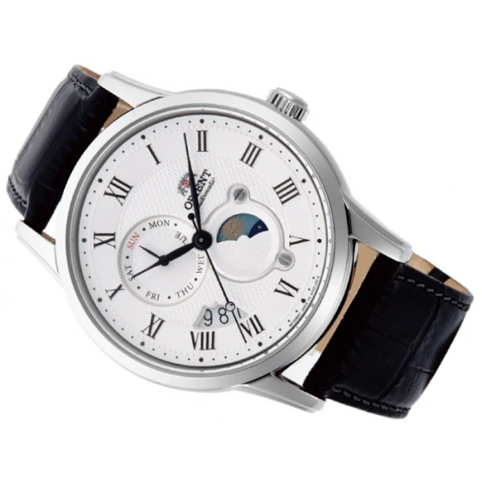 Zegarek ORIENT RA-AK0008S10B to elegancki model przeznaczony dla mężczyzn lubiących otaczać się dodatkami na najwyższym poziomie. Czasomierz japońskiej marki charakteryzuje się precyzją wykonania i świetnym designem. Do produkcji tego urządzenia użyto najlepszych materiałów dostępnych na rynku. Koperta została wykonana z nierdzewnej i antyalergicznej stali szlachetnej. Pasek uszyto z niezwykle wygodnej i trwałej skóry naturalnej. Wyróżniający się jasny cyferblat zabezpiecza odporne na zarysowania i stłuczenia szkiełko szafirowe. Dodatkowo na tarczy umieszczono bardzo przydatny datownik dni miesiąca, który pozwoli na szybkie odczytania aktualnej daty oraz wskaźnik faz księżyca. W tym przypadku wodoszczelność plasuje się na poziomie 5 ATM i pozwala na delikatne zachlapania wodą. Model napędza mechanizm automatyczny z rezerwą chodu do 40 godzin.