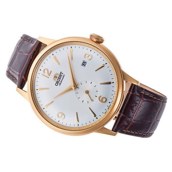 Elegancki zegarek męski ORIENT RA-AP0004S10B z kolekcji Bambino. Wyposażony w automatyczny mechanizm F622 oparty na 24 kamieniach i rezerwą chodu do 40 godzin. Biała tarcza zegarka pokryta jest mineralnym szkiełkiem odpornym na uderzenia. Producent zadbał nie tylko o precyzyjne wykonanie ale również o możliwość wglądu w pracę mechanizmu poprzez przeszklony dekielek z tyłu zegarka. Dodatkowym atutem jest praktyczny datownik wskazujący aktualny dzień miesiąca a czas odmierza sekundnik na mniejszej sub-tarczy. Całość zamyka elegancki, brązowy pasek wykonany z wysokogatunkowej skóry naturalnej.