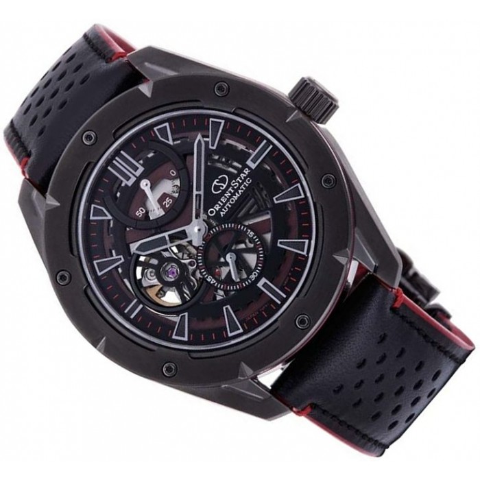 Zegarek ORIENT STAR Sports Skeleton RE-AV0A03B00B to czasomierz dedykowany dla mężczyzn, którzy poszukują wyjątkowego modelu o doskonałych parametrach. Tarcza typu skeleton w odcieniach czerni i fioletu doskonale koresponduje z czarno-czerwonym paskiem wykonanym ze skóry. Zegarek ten zasilany jest dzięki mechanizmowi automatycznemu Orient F6F44 z rezerwą chodu 48 godzin. Stalowa koperta ma kolor czarny, a dzięki swoim właściwościom skutecznie chroni mechanizm przed uszkodzeniami. W tym modelu producent zastosował szkiełko szafirowe, które jest w 100% odporne na zarysowania. Zegarek ORIENT STAR Sports Skeleton RE-AV0A03B00B odznacza się wodoszczelnością klasy 10 ATM, czyli 100 metrów. Dzięki temu możemy z nim pływać oraz brać prysznic bez zmartwień o zachlapania.