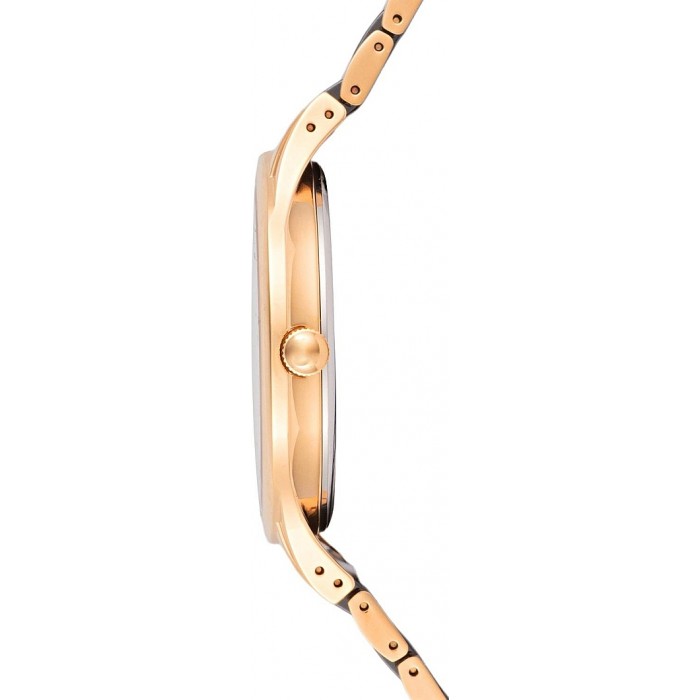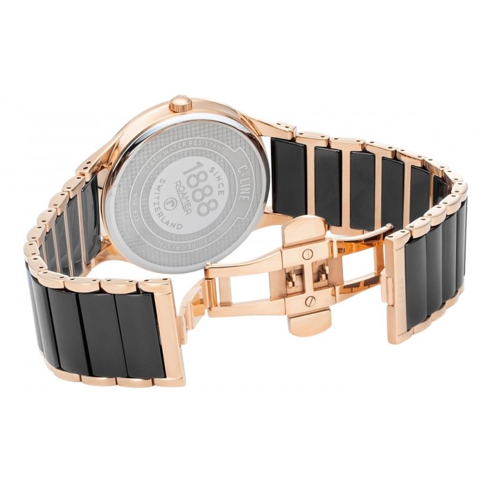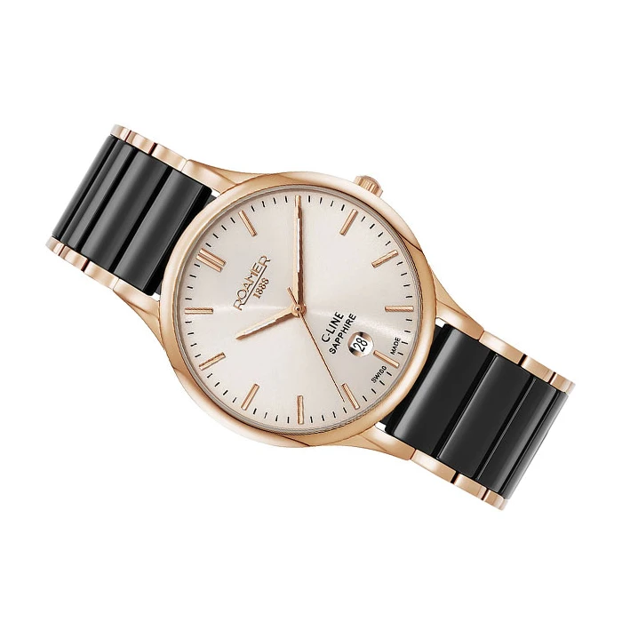 Zegarek ROAMER 658833 49 35 61 C-Line to propozycja kierowana do mężczyzn, którzy poszukują idealnego dodatku na co dzień. Model ten będzie odpowiednim wyborem dla każdej osoby, która ceni sobie połączenie dobrego designu i najlepszego kunsztu wykonania. Ma on jasną tarczę, którą wzbogacono o datownik wskazujący odpowiedni dzień miesiąca. Cyferblat przykryty jest szafirowym szkiełkiem, które cechuje się doskonałą przejrzystością oraz odpornością na zarysowania. Koperta i wybrane elementy bransolety w kolorze modnego, różowego złota wykonane są ze stali szlachetnej. Co więcej, bransoletę zdobią także ceramiczne wstawki w ekskluzywnym odcieniu czerni. Sercem czasomierza jest mechanizm kwarcowy, który odpowiada za precyzyjne odmierzanie czasu.