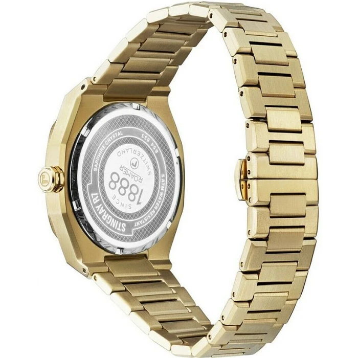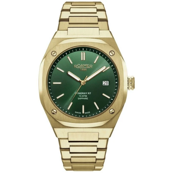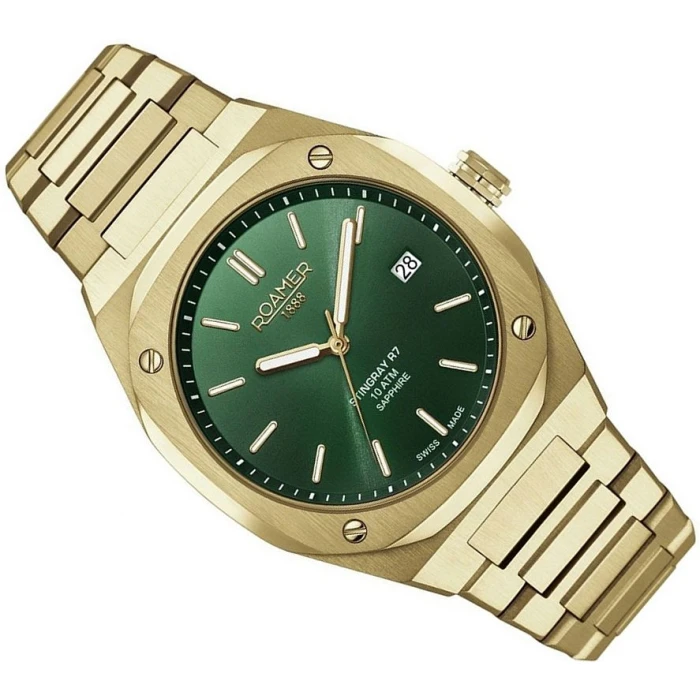 Zegarek męski Roamer 854833 48 75 50 z najnowszej kolekcji STINGRAY R7 w złotej kolorystyce z zieloną tarczą. Uwagę zwraca niestandardowy kształt koperty i niebanalna stylistyka.