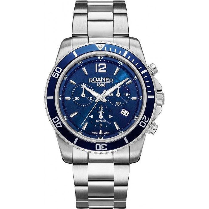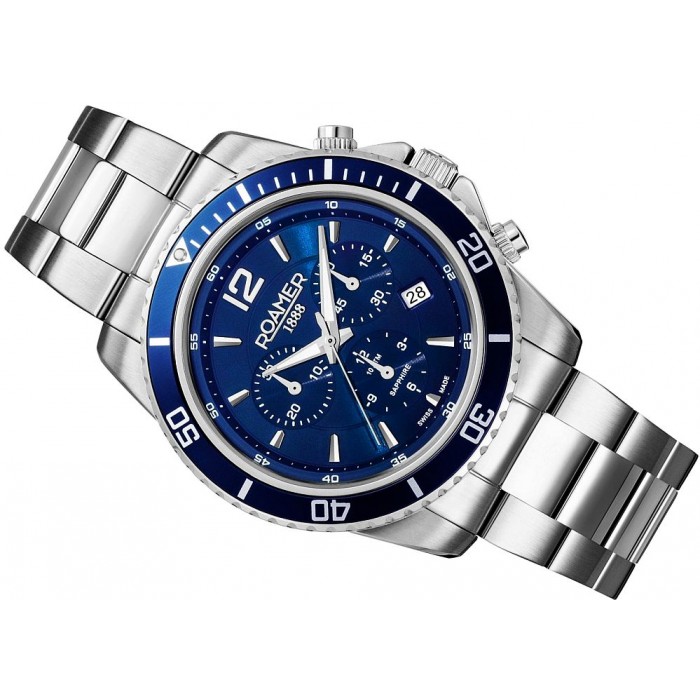 Zegarek męski Roamer 862837 41 45 20 z najnowszej kolekcji Nautic w eleganckiej, srebrno-niebieskiej kolorystyce dla mężczyzn wymagających i pewnych siebie. Model wyposażony został w niezawodny mechanizm kwarcowy Ronda 5030.D zasilany baterią. Niebieską tarczę pokrywa szkiełko szafirowe odporne na zarysowania. Zarówno koperta jak i bransoleta wykonane zostały ze stali szlachetnej 316l zapewniającej wysoką jakość i trwałość. Praktyczny datownik przy godzinie 4-ej wskazuje aktualny dzień miesiąca. Dodatkowym wyposażeniem jest chronograf – stoper analogowy służący do pomiaru czas. Wskazówki pokryte zostały warstwą fosforyzująca, która po naświetleniu w dzień jest widoczna jest po zmroku. Wodoszczelność na poziomie aż 100m (10atm) daje pewność działania podczas kąpieli czy pływania w wodzie.