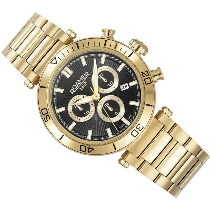 Zegarek męski Roamer 994837 48 85 20 z kolekcji Toscana w przyciągającej uwagę czarno-złotej kolorystyce dla mężczyzn wymagających i pewnych siebie.