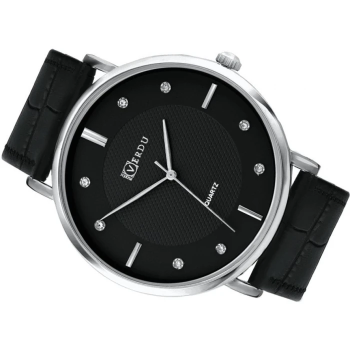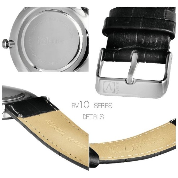 Zegarek męski Ruben Verdu Traje RV1002 napędzany jest za pomocą mechanizmu kwarcowego. Czarna tarcza przykryta jest szkiełkiem mineralnym. Wodoszczelność na poziomie 3 ATM (30m) sprawia, że czasomierz jest odporny na niewielkie zachlapania - nie wolno wchodzić z nim do wody! Koperta wykonana jest z metalu i utrzymana na skórzanym, czarnym pasku. Produkt objęty jest dwuletnią gwarancją producenta.