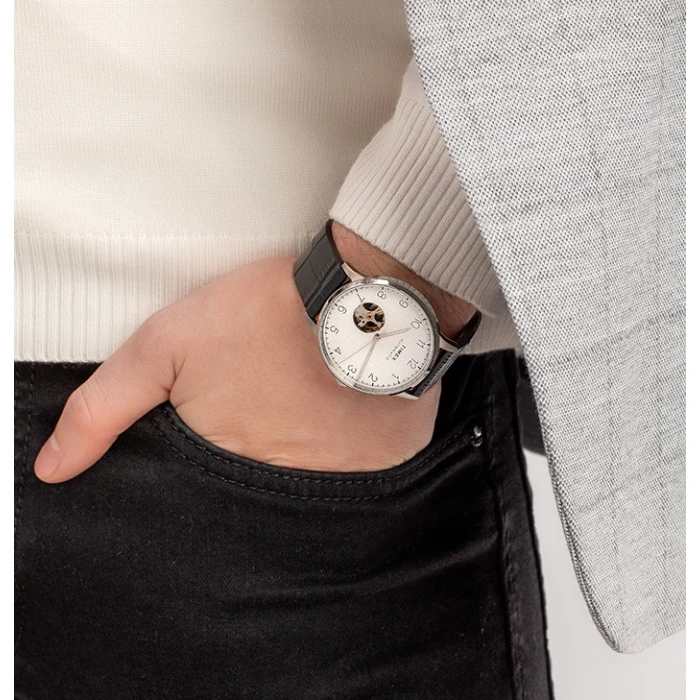 - Klasyczny design z nutą nowoczesności: Koperta ze stali nierdzewnej o średnicy 40 mm i grubości 12 mm w srebrnym wykończeniu prezentuje się elegancko na każdym nadgarstku. Srebrna tarcza z otwartym sercem (open heart) ukazuje pracę mechanizmu, dodając zegarkowi unikalnego charakteru. Czarna, skórzana bransoleta z krokodylim wzorem (19 mm szerokości) podkreśla luksusowy, ponadczasowy styl.