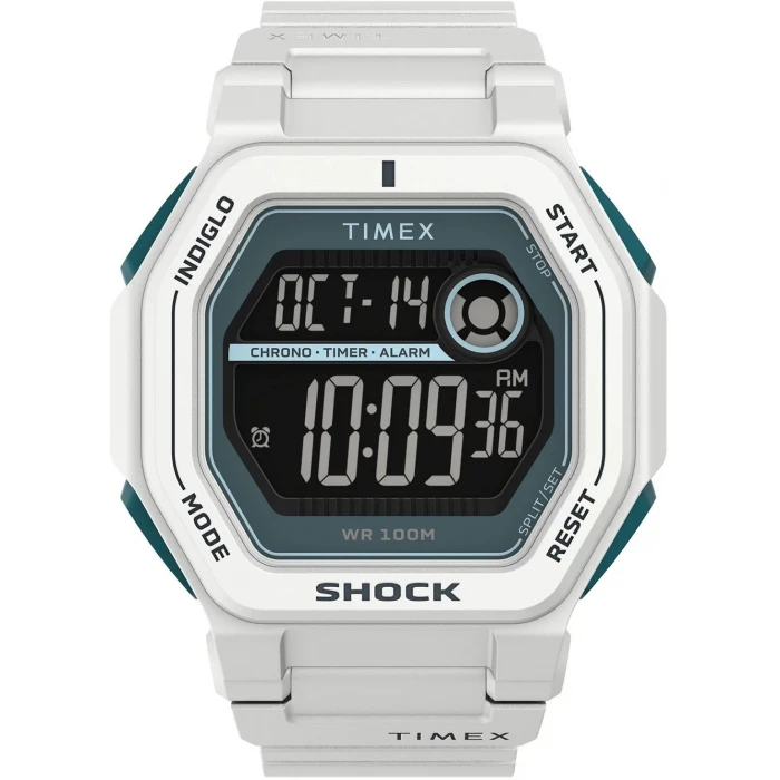 TIMEX TW2V63600 to elektroniczny model, napędzany za pomocą precyzyjnego mechanizmu kwarcowego, zasilanego baterią o średniej żywotności około 2 lat. Koperta o niestandardowym kształcie wykonana została z wysokiej jakości, wytrzymałego tworzywa co gwarantuje odporność na warunki atmosferyczne. Zegarek zestawiono z wygodnym paskiem w białej barwie. Ten typ paska to popularna alternatywa dla klasycznej bransolety, stosowana w sportowych modelach. Zapewnia komfort noszenia i łatwość w czyszczeniu. Zapięcie na sprzączkę pozwala na regulację długości obwodu paska i dopasowanie czasomierza do nadgarstka. Tarcza zabezpieczona została szkiełkiem mineralnym, które dzięki swojej elastyczności doskonale chroni cyferblat zegarka.