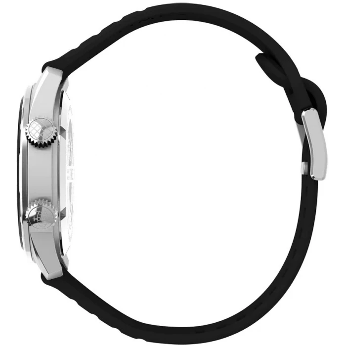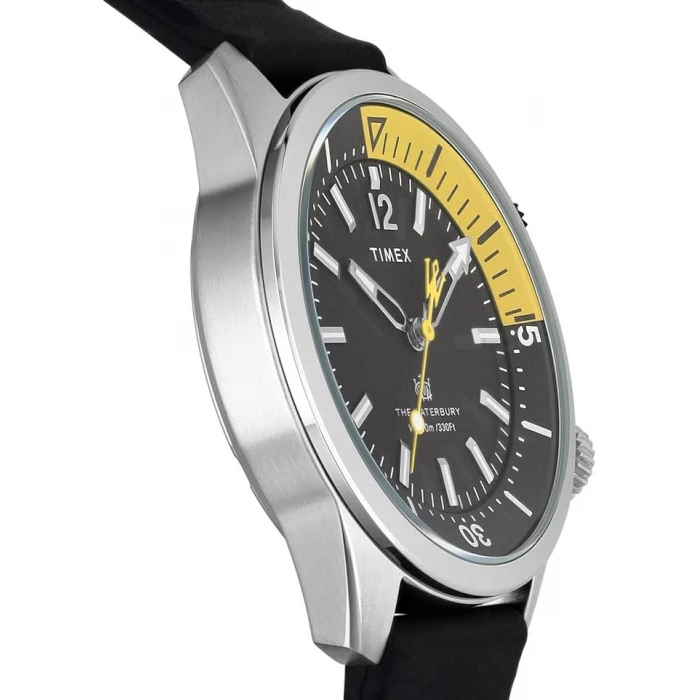 TIMEX TW2V73400 to kolejny model inspirowany pierwszymi zegarkami z kolekcji Waterbury, opatrzony kultowym logo Waterbury Watch Company. Czasomierz wyposażono w mechanizm kwarcowy, zasilany baterią o średniej żywotności około 2 lat. Koperta w stylowym srebrnym kolorze, została wykonana z hipoalergicznej, odpornej na warunki atmosferyczne oraz korozję stali szlachetnej. Całość zawieszona na sportowym pasku z wysokiej jakości tworzywa. Ten typ paska to wygodna alternatywa dla klasycznej bransolety. Jest wygodny w noszeniu a przy tym łatwy w czyszczeniu. Tradycyjne zapięcie na sprzączkę daje możliwość szybkiej regulacji i dopasowania do nadgarstka. Czarną tarczę pokryto szkiełkiem mineralnym, które dzięki swojej elastyczności i trwałości doskonale chroni tarczę zegarka przed zarysowaniem.