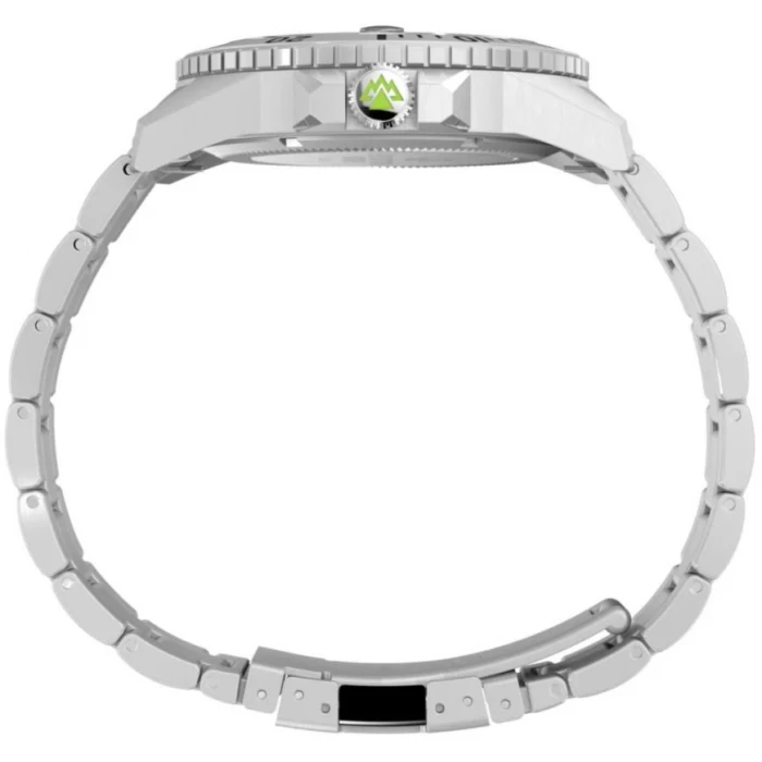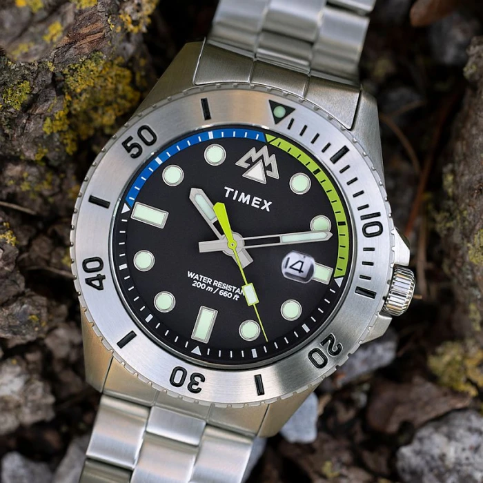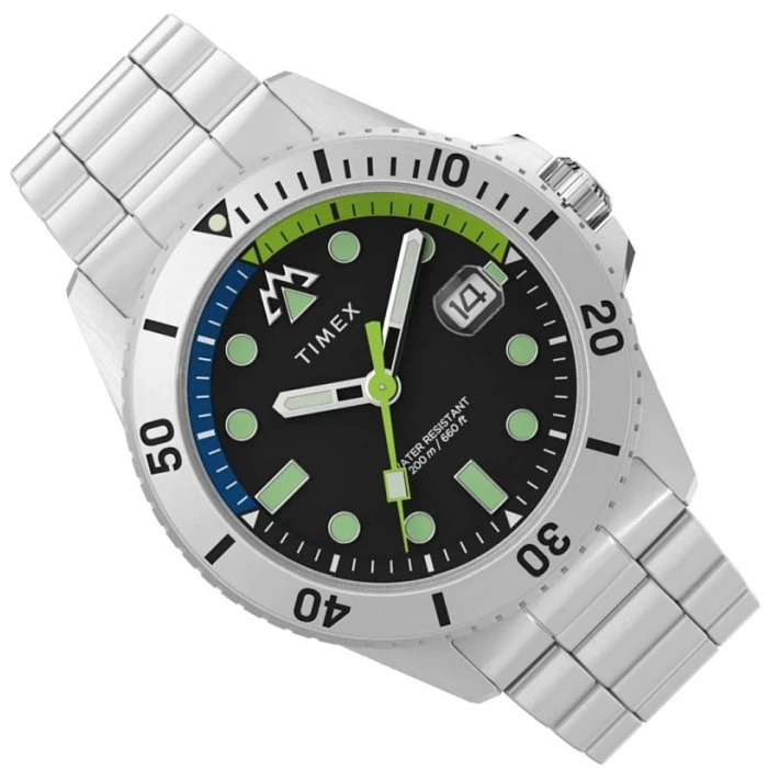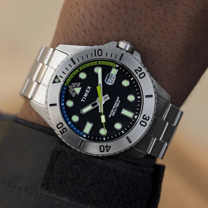 Timex TW2W41900 zachwyca autentycznym, diverowym wyglądem z energizującymi akcentami. Czarna tarcza z dużymi luminescencyjnymi indeksami i wskazówkami zapewnia doskonałą czytelność nawet w słabym oświetleniu, a szczotkowana koperta ze stali nierdzewnej o średnicy 42 mm współgra z regulowaną bransoletą ze stali nierdzewnej z zapięciem zatrzaskowym. Waga ok. 150 g i solidna konstrukcja sprawiają, że zegarek pewnie leży na nadgarstku (pasuje do obwodów 150-205 mm), pasując do casualowych i sportowych stylizacji. To, co dodatkowo przykuwa uwagę, to jednokierunkowy bezel do mierzenia czasu oraz niebiesko-limonkowe detale.