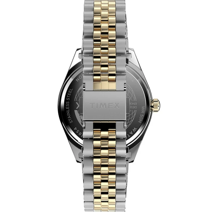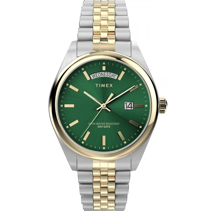 TIMEX TW2V53800 to elegancki czasomierz inspirowany modelami typu diver. Napędza go precyzyjny mechanizm kwarcowy zasilany baterią. Kopertę w ponadczasowym srebrnym kolorze wykonano z wysokiej jakości stali szlachetnej, odpornej na warunki atmosferyczne oraz korozję. Jest odpowiednia dla alergików i osób ze skórą skłonną do podrażnień. Czasomierz zawieszony został na trzyrzędowej, dwutonowej srebrno złotej bransolecie. Zapięcie motylkowe, które zastosowano w zegarku pozwala na szybki zakładanie i zdejmowanie, a dodatkowe zabezpieczenie chroni przed jej samoistnym odpinaniem się. Przykuwającym uwagę elementem jest stylistyka zegarka nawiązująca do klasycznych zegarków z podwójnym datownikiem, które charakteryzuje wyświetlanie dni miesiąca klasycznie na godz. 3:00 natomiast na godz 12:00 odczytamy aktualny dzień tygodnia. Tarcza w zielonejej barwie wykończona została szlifem słonecznym, który tworzy ciekawe efekty wizualne w zależności od kąta padania światła. Całość zabezpieczona została szkiełkiem mineralnym odpornym na zarysowania i pęknięcia. .