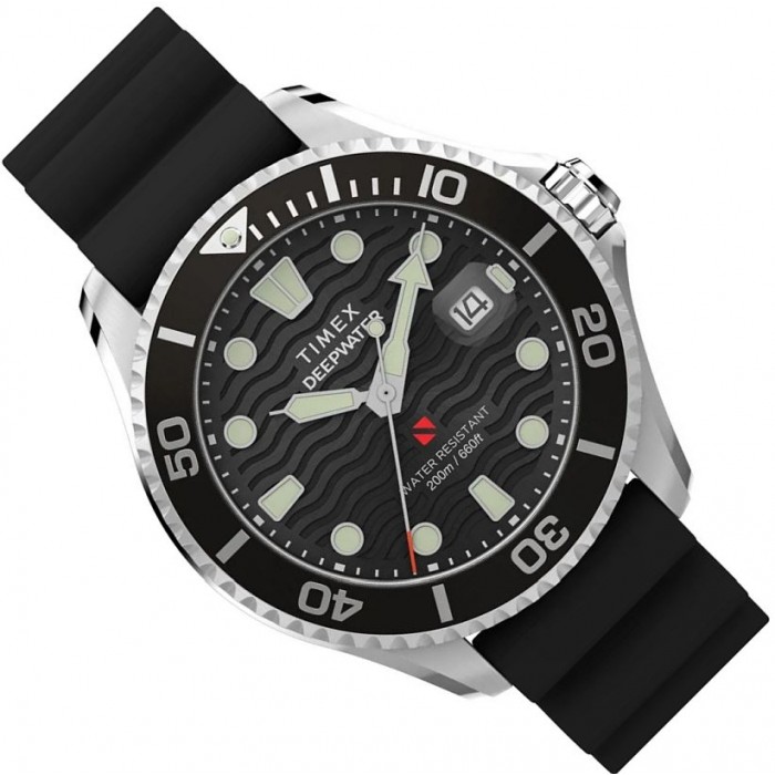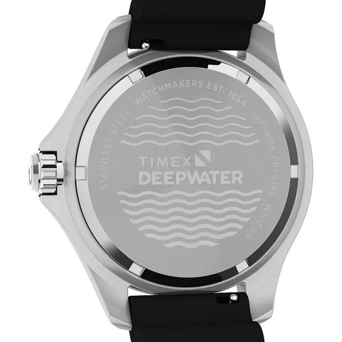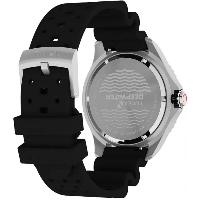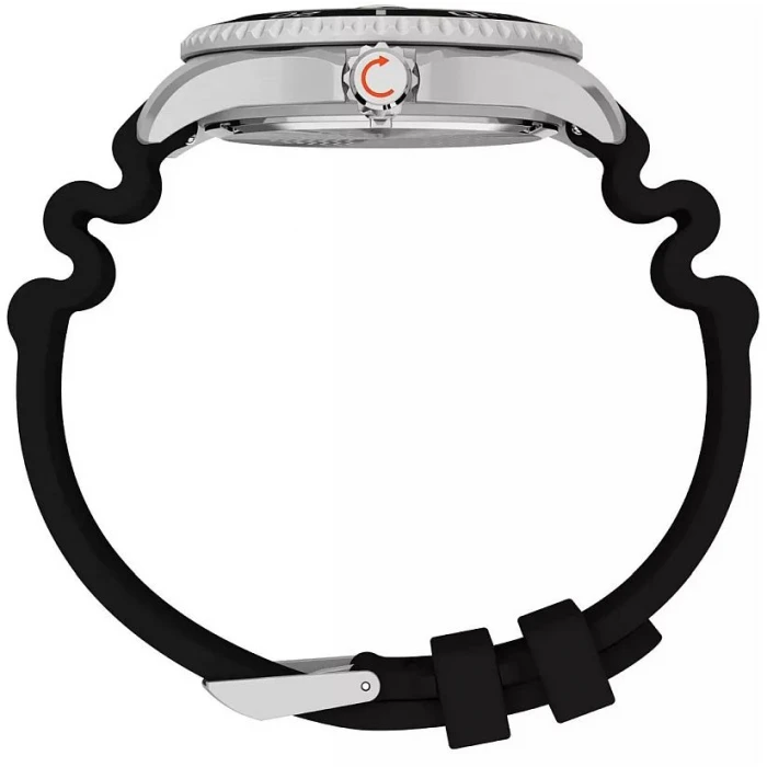 Timex TW2W81600 zachwyca autentycznym, diverowym wyglądem z nutą elegancji. Czarna tarcza z falistym wzorem (wave-textured) i luminescencyjnymi indeksami i wskazówkami zapewnia doskonałą czytelność nawet w głębokiej wodzie, a polerowana koperta ze stali nierdzewnej o średnicy 44 mm współgra z czarnym, syntetycznym paskiem z żywicy z wygodnym zapięciem na sprzączkę. Waga ok. 150 g i solidna konstrukcja sprawiają, że zegarek pewnie leży na nadgarstku (pasuje do obwodów 142-205 mm), pasując do casualowych i sportowych stylizacji. To, co dodatkowo przykuwa uwagę, to obrotowy bezel do mierzenia czasu oraz czerwone akcenty na wskazówce sekundnika.