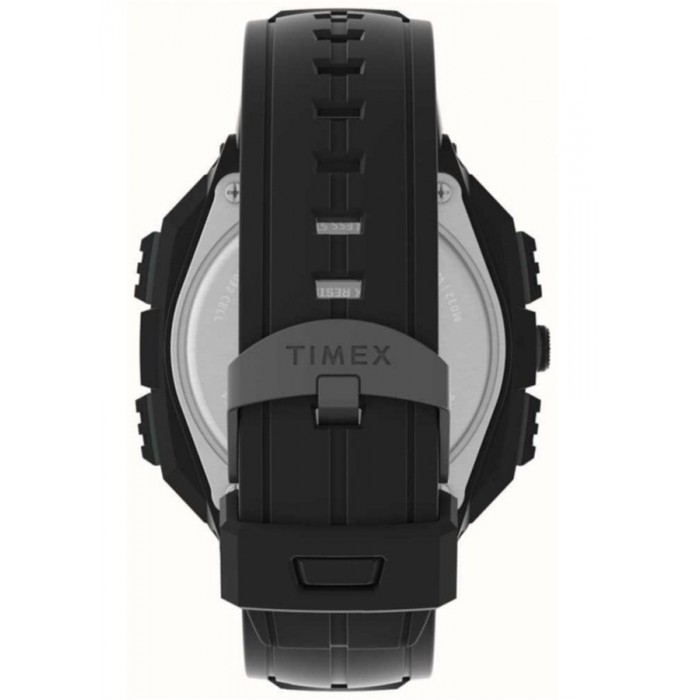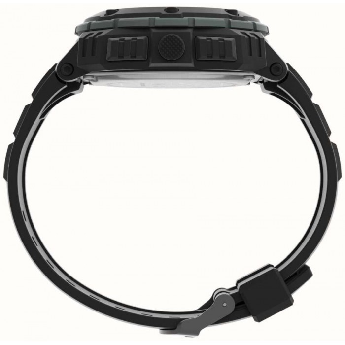 TIMEX TW4B27200 to wielofunkcyjny, sportowy model w stylu diver. Wyposażony został w precyzyjny mechanizm kwarcowy, zasilany baterią o średniej żywotności około 2 lat. Okrągła koperta w czarnym kolorze, wykonana została z wytrzymałego tworzywa, utwardzonego żywicą, co gwarantuje odporność na różnego rodzaju upadki. Całość zawieszono na wygodnym, czarnym pasku wykonanym z tworzywa. Jest to popularna alternatywa dla klasycznej bransolety, stosowana w sportowych modelach. Przykuwającym uwagę elementem jest tu stylistyka zegarka nawiązująca do typowych nurków, które charakteryzuje wypukła luneta z obrotowym bezelem. Odsłonięte śruby dodają dynamiki i sprawiają, że czasomierz zdecydowanie wyróżnia się na tle innych modeli. Tarcza pokryta została szkiełkiem mineralnym, które dzięki swojej elastyczności i wytrzymałości doskonale chroni cyferblat przed uszkodzeniem.