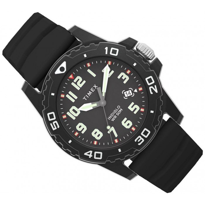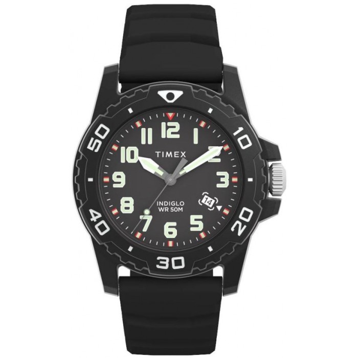 TIMEX TW5M61200 to zegarek męski w wyróżniającej się, czarnej kolorystyce w sportowym stylu nurka. Model posiada mechanizm zasilany baterią. Okrągła koperta wykonana została z wytrzymałego tworzywa, co gwarantuje odporność na różnego rodzaju upadki. Całość zawieszono na wygodnym, silikonowym pasku. Zapięcie na klasyczną sprzączkę, które zastosowano w czasomierzu umożliwi szybkie zakładanie i zdejmowanie zegarka oraz daje możliwość samodzielnej regulacji długości dopasowując go do nadgarstka. Tarcza opatrzona w wyraźne cyfry arabskie w miejscu indeksów pokryta została szkiełkiem akrylowym, które jest bardzo lekkie i wytrzymałe.