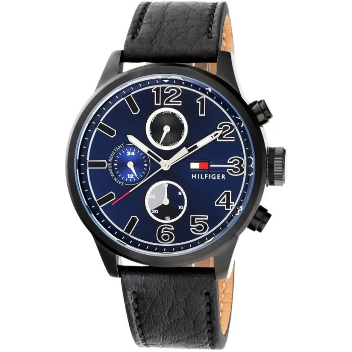 Zegarek męski TOMMY HILGIFER o numerze seryjnym 1791241 jest napędzany przez mechanizm kwarcowy, który umieszczono w kopercie wykonanej ze stali szlachetnej. Na granatowej tarczy znajdują się dwa datowniki odpowiedzialne za pokazywanie aktualnego dnia tygodnia i miesiąca. Dodatkowo obok godziny 9 umiejscowiona jest mała tarcza czasu 24-godzinnego.  Zegarek pokryty jest odpornym na stłuczenia mineralnym szkiełkiem. Całość utrzymana jest na skórzanym pasku.