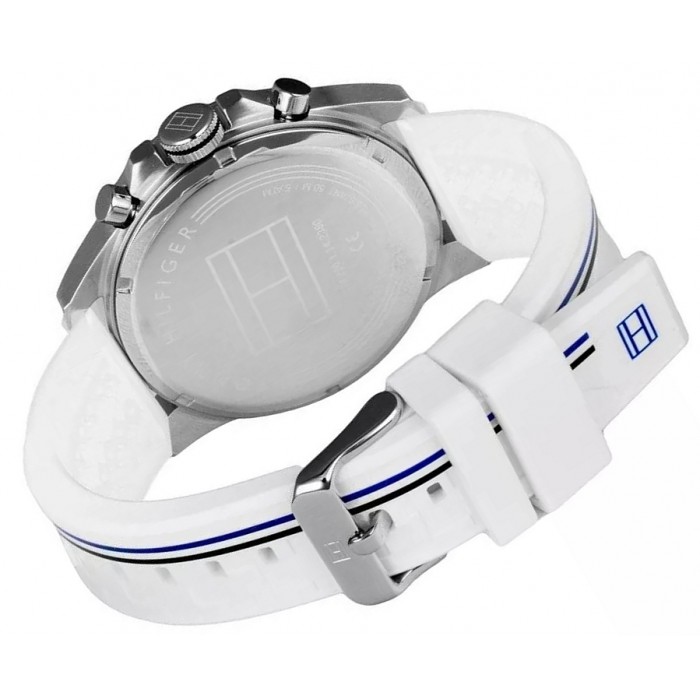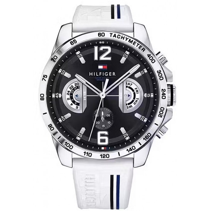 Zegarek męski TOMMY HILFIGER 1791475 pochodzi ze sportowej kolekcji Decker w modnej, kontrastowej kolorystyce czerni i bieli. Za precyzyjne wskazania chodu odpowiada niezwykle funkcjonalny japoński mechanizm kwarcowy. Na cyferblacie modelu TH1791475 umieszczono datownik, wskazujący aktualny dzień miesiąca oraz tygodnia ale także 24godzinną tarczę pełniącą funkcję czasu dobowego.  Dodatkowo na obwodzie tarczy umieszczono skalę tachometru z pomocą której w szybki sposób obliczymy chociażby prędkość poruszania się. Warto podkreślić iż wskazówki modelu 1791345 zostały pokryte specjalną warstwą luminescencyjną dzięki czemu po uprzednim naświetleniu będą podświetlać się, ułatwiając tym samym odczyt godziny w zaciemnionych miejscach. Wodoszczelność utrzymana została na poziomie 5 ATM a to sprawia, że jest odporny na krótkotrwałe zanurzenie w wodzie. Niebieską tarczę chroni szkiełko mineralne odporne na stłuczenia.. Całość wykonano zgodnie z najnowszymi trendami oraz utrzymano na bardzo wygodnym pasku z tworzywa sztucznego, dzięki czemu zegarek Tommy Hilfiger 1791475 stanie się idealnym dopełnieniem naszej sportowej garderoby.
