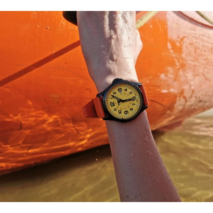 Dodatkowym atutem jest wodoszczelność na poziomie 10 atm pozwalająca na swobodne pływanie. Całość zamyka wygodny i niezwykle wytrzymały pasek gumowy w kolorze pomarańczowym.