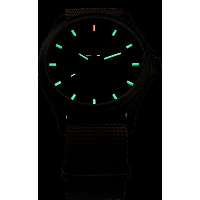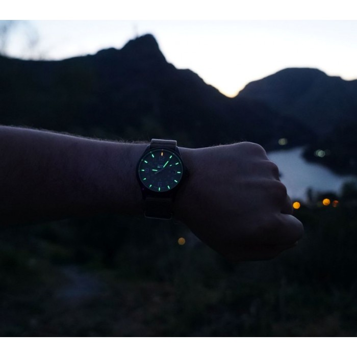 Na tarczy znajduje się praktyczny datownik wskazujący aktualny dzień miesiąca. Warto podkreślić, iż bezbłędną czytelność zapewniają rureczki ze świecącym trytem umieszczone na wszystkich trzech wskazówkach, w miejscu indeksów a także podkreślają logo producenta. Warstwa Superluminova, którą pokryta jest uszczelka szkła szafirowego po naświetleniu tworzy spektakularny, świetlisty krąg. Dodatkowym atutem jest wodoszczelność na poziomie 10 atm pozwalająca na swobodne pływanie. Całość zamyka wygodny i niezwykle wytrzymały pasek tekstylny Nato, który posiada aż 3 szlufki, dzięki którym dopasowanie zegarka do każdego męskiego nadgarstka nie będzie stanowiło problemu.