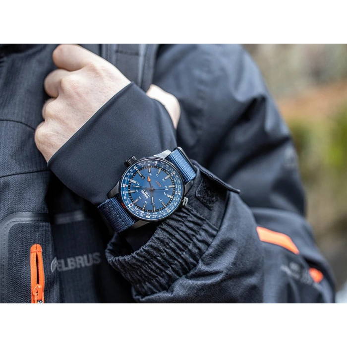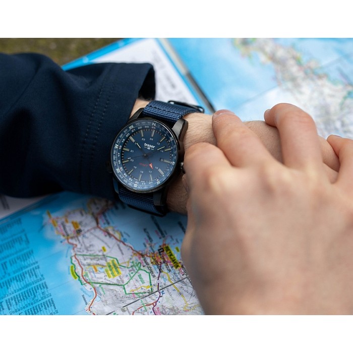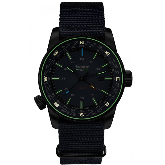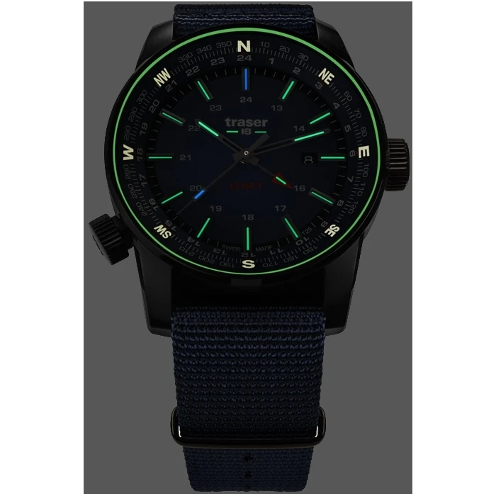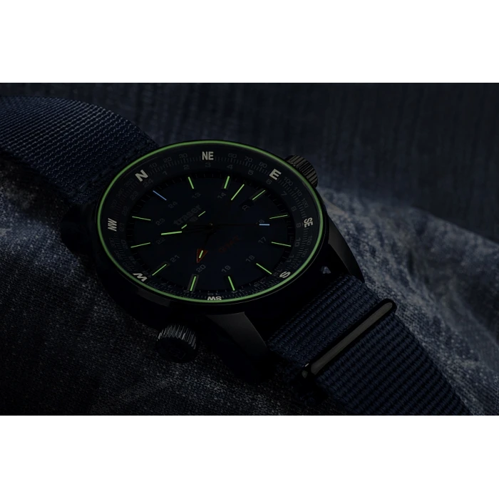 Na tarczy znajduje się datownik oraz czwarta wskazówka odpowiadająca za wskazanie drugiego czasu. Warto dodać iż rureczki ze świecącym trytem umieszczono na wszystkich czterech wskazówkach. Suwak wskazań kompasu obsługiwany druga koronką na godz 8:00 można wykorzystać także jako stoper minutowy bądź jako wskaźnik drugiej strefy czasowej. Całość zamyka odporny na czynniki zewnętrzne, trwały pasek nylonowy typu NATO.