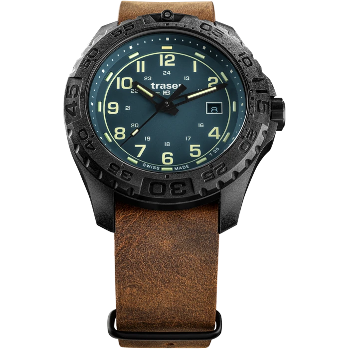 Zegarek Traser TS-109040 P96 Outdoor Pioneer Evolution Petrol to synonim czasomierza idealnego. Połączenie trzech kolorów, czyli brązowego z czarnym i niebieskim to kombinacja, obok której nikt nie przejdzie obojętnie. Użycie do produkcji najlepszych materiałów oraz funkcje takie jak datownik dni miesiąca, wstrząsoodporność i technologia trigalight®, która odpowiada za podświetlenie indeksów i wskazówek dla ich lepszej widoczności i czytelności, sprawiają, że ten zegarek to najlepszy wybór. Koperta została wykonana z lekkiego i wytrzymałego polimeru zbrojonego włóknem szklanym. Pasek uszyto z wygodnej skóry naturalnej. Cyferblat zabezpiecza szkiełko szafirowe. Urządzenie napędza niezwykle precyzyjny szwajcarski mechanizm kwarcowy Ronda 515, zasilany baterią. Wodoszczelność na poziomie 20 ATM pozwala na pływanie i nurkowanie na dużych głębokościach wraz z urządzeniem na ręku.