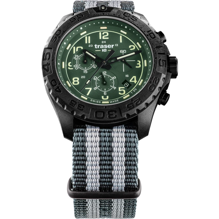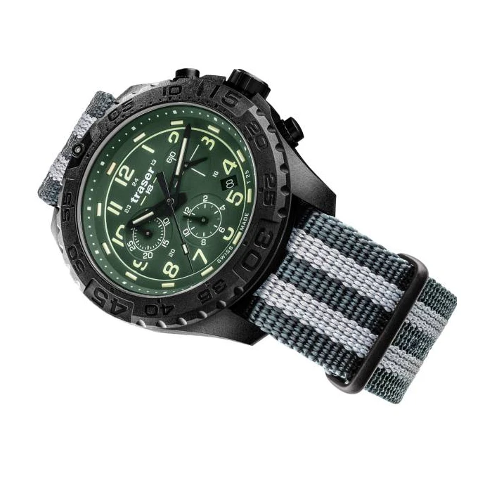 Zegarek Traser TS-109048 P96 Outdoor Pioneer Evolution Chrono Green cechuje się wytrzymałością i świetnym designem, który przypadnie do gustu mężczyznom z charakterem. Funkcjonalność w szwajcarskich czasomierzach Traser jest najważniejsza. Model ten wyposażony został w datownik dni miesiąca, chronograf, wstrząsoodporność oraz bardzo przydatną technologię trigalight®, dzięki której wskazówki i indeksy będę doskonale widoczne nawet w godzinach nocnych. Kopertę wyprodukowano z bardzo lekkiego polimeru zbrojonego włóknem szklanym. Pasek tekstylny typu NATO w dwóch odcieniach szarości idealnie leży na nadgarstku. Do zabezpieczenia cyferblatu użyto szkiełka szafirowego o doskonałych właściwościach ochronnych. Zegarek Traser TS-109048 P96 Outdoor Pioneer Evolution Chrono Green napędza precyzyjny i bezawaryjny mechanizm kwarcowy Ronda 5030, a jego wodoszczelność plasuje się na poziomie 20 ATM i pozwala na pływanie i nurkowanie na dużych głębokościach wraz z czasomierzem na ręku.