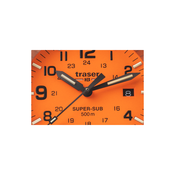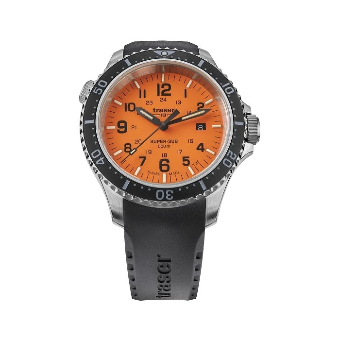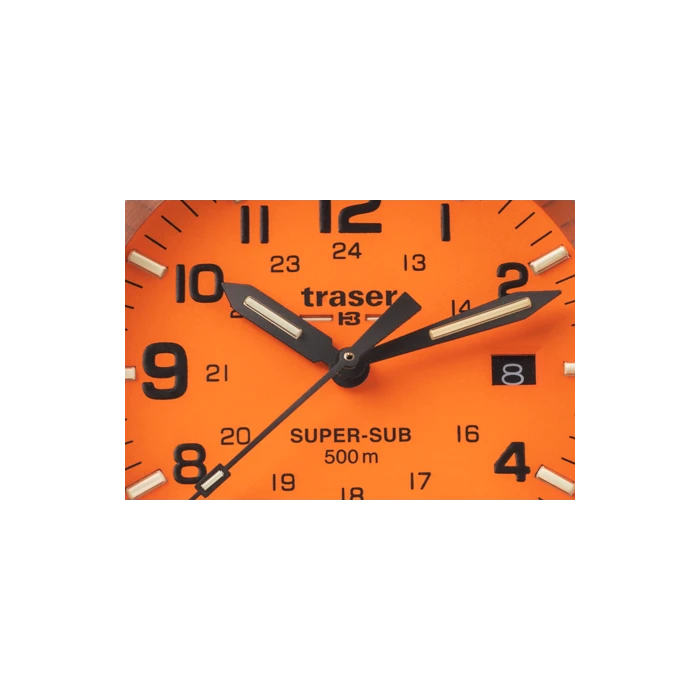 Zegarek Traser TS-109380 P67 Diver Orange to solidny i wytrzymały czasomierz idealny dla fanów sportów wodnych. Modele z kolekcji Diver mają znakomite właściwości, takie jak: wodoszczelność na poziomie 50 ATM, która pozwala na profesjonalne nurkowanie oraz zawór helowy, dzięki któremu można schodzić pod wodę w specjalnych dzwonach divingowych. Kopertę wyprodukowano z antyalergicznej i nierdzewnej stali szlachetnej. Kauczukowy pasek w szarym kolorze wygodnie leży na męskim nadgarstku. Cyferblat w ciekawym pomarańczowym kolorze zabezpiecza szkiełko szafirowe, charakteryzujące się odpornością na stłuczenia i zarysowania. Na tarczy obok godziny trzeciej zlokalizowano datownik dni miesiąca. Dodatkowo urządzenie wyposażono w czas dobowy oraz technologie trigalight®, która odpowiada za podświetlanie indeksów i wskazówek dla ich doskonałej widoczności i czytelności o każdej porze dnia lub nocy. Zegarek Traser TS-109380 P67 Diver Orange napędza precyzyjny i bezawaryjny mechanizm kwarcowy Ronda 715.