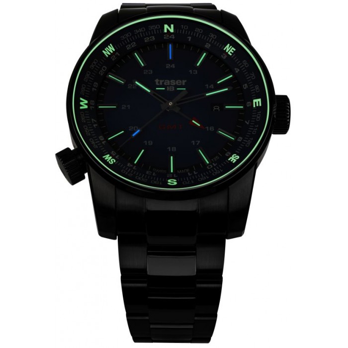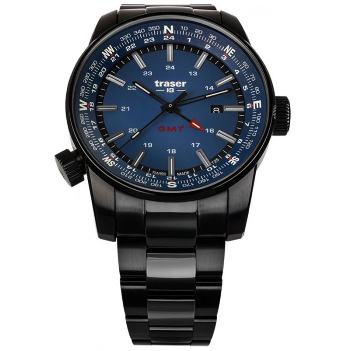 TRASER TS-109524 P68 Pathfinder GMT Blue wyposażony został w praktyczny datownik wskazujący aktualny dzień miesiąca, wskaźnik drugiego czasu Gmt a także skalę kompasu dzięki której można wyznaczać azymut oraz kierunek podróży bez konieczności korzystania z GPSu. Do ustawienia wskazań powyższych funkcji służą dwie poręczne koronki. Dodatkowym atutem jest wodoszczelność na poziomie 10 atm, która pozwala na swobodne pływanie.