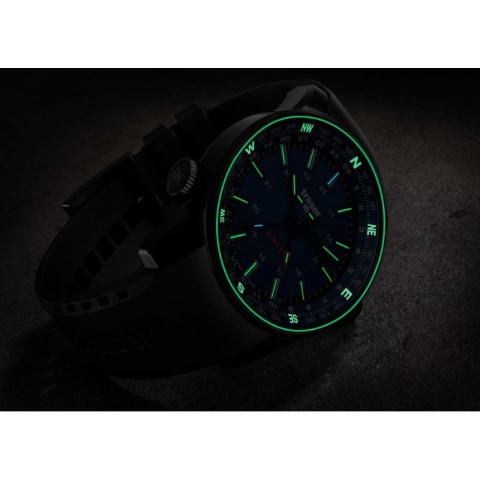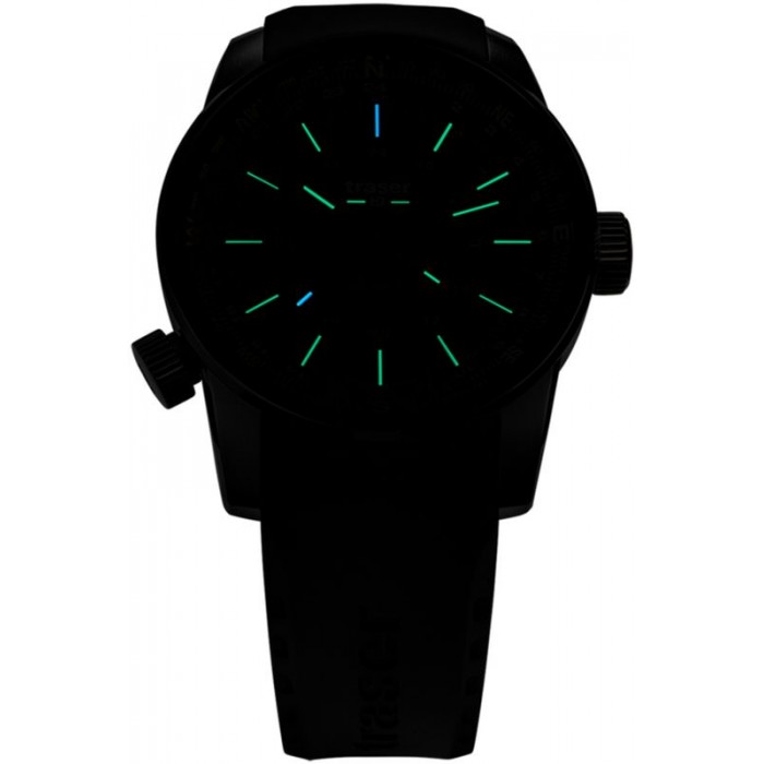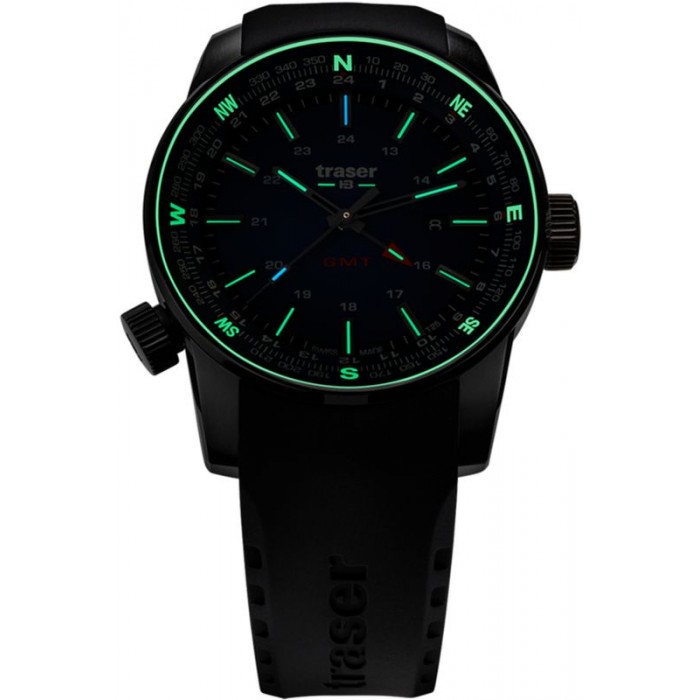 Na tarczy znajduje się datownik oraz czwarta wskazówka odpowiadająca za wskazanie drugiego czasu. Warto dodać iż rureczki ze świecącym trytem umieszczono na wszystkich czterech wskazówkach. Suwak wskazań kompasu obsługiwany druga koronką na godz 8:00 można wykorzystać także jako stoper minutowy bądź jako wskaźnik drugiej strefy czasowej. Całość zamyka odporny na czynniki zewnętrzne, trwały pasek gumowy w kolorze czarnym.