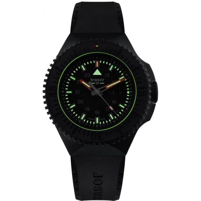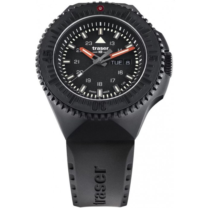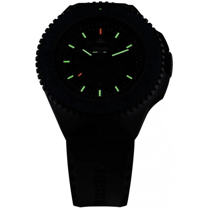 Męski model TRASER TS-109855 na tarczy posiada podwójny datownik wskazujący dzień miesiąca jak i dzień tygodnia - Day-Date. Warto dodać iż rureczki ze świecącym trytem umieszczono na wskazówkach godzinowej i minutowej a także pod indeksami. Bezel można wykorzystać zarówno jako stoper minutowy bądź jako wskaźnik drugiej strefy czasowej. Całość zamyka czarny wysokogatunkowy pasek wykonany z odpornego kauczuku.