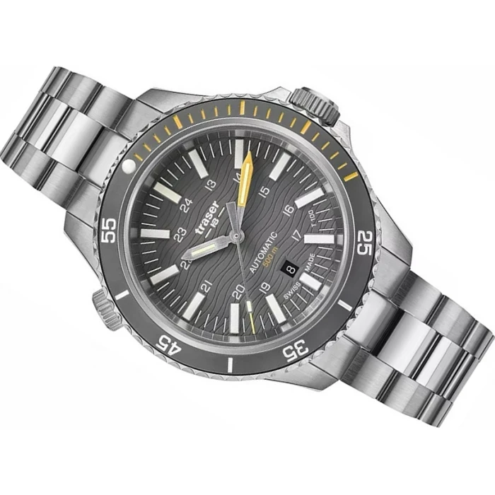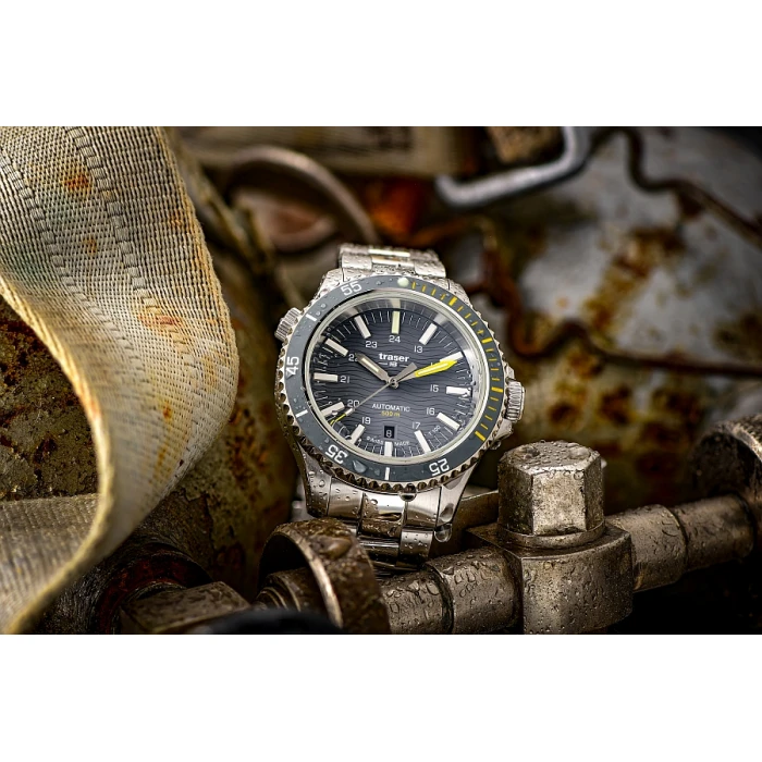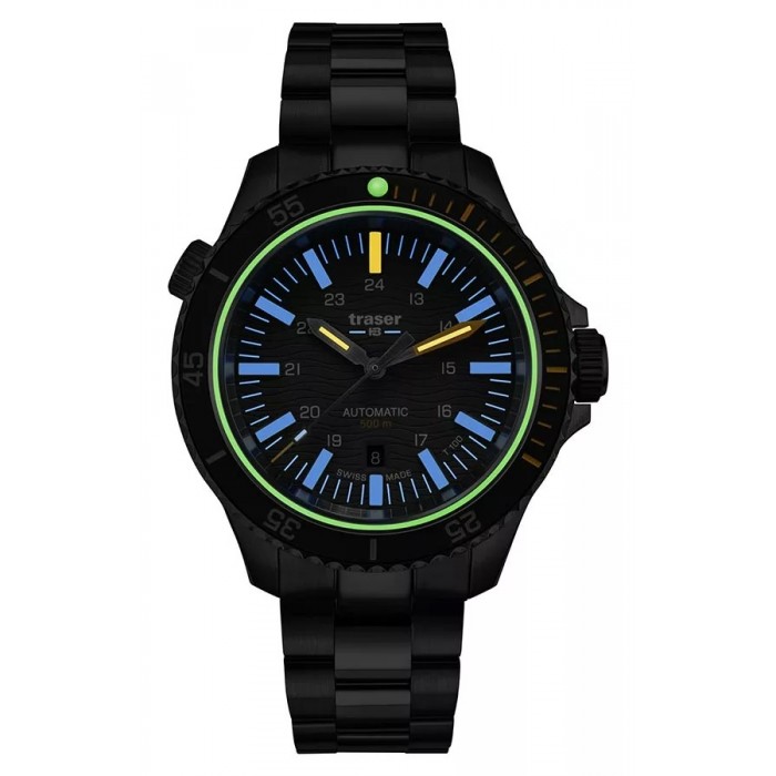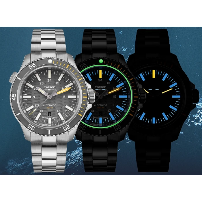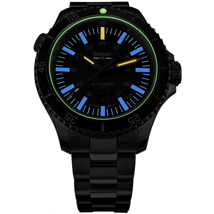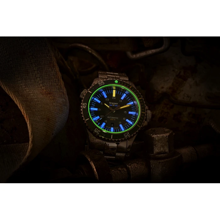 Stopień szczelności WR500 (50ATM) mówi nam o tym że zegarek jest odporny na bardzo wysokie ciśnienie pozwalając na głębinowe nurkowanie ale również to że męski model Traser 110329 P67 SuperSub Diver T100 musi być solidnie i niezwykle precyzyjnie wykonany. Jednak każdy model typu nurek potrzebuje także dobrego oświetlenia a ten otrzymał aż jego 2 formy. Niektóre elementy indeksów jak i wewnętrzna uszczelka szkiełka zostały pokryte masą fosforescencyjną wyprodukowaną przez firmę Super-LumiNova®. która idealnie podświetla tarczę przez pierwsze godziny po zmroku. Gdy luminescencja zaczyna tracić swój blask to wówczas do głosu dochodzi niezawodna technologia opracowana przez szwajcarską firmę mb microtec. Mowa o trytowym źródle podświetlania – trigalight®. Każdy z indeksów godzinowych został wzmocniony przez rurkę z gazem H3 (tryt), każda wskazówka posiada ją na swojej górnej części. Markery trigalight® występują również pod logotypem marki na tarczy zegarka. Świecą one przez 24h przez 25 lat!