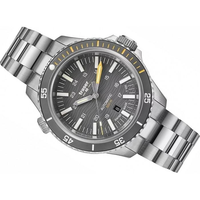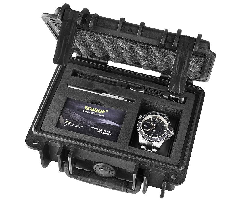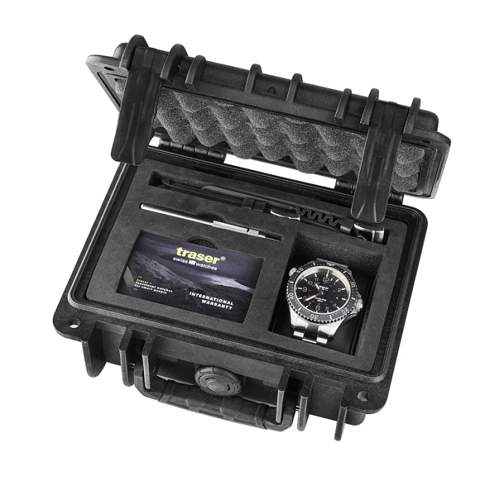 Męski zegarek Traser P67 SuperSub T100 Grey Set to rasowy pełnokrwisty Diver, który posiada zakręcaną zarówno koronkę jak i dekiel, zawór helowy oraz antyrewersyjny, ceramiczny pierścień. Wskazówki napędza szwajcarski mechanizm z naciągiem automatycznym Sellita SW-200. Osadzony na 26 kamieniach posiada funkcję stop sekundy, możliwość dokręcenia koronką oraz rezerwę chodu do 38 godzin i dokładnością +/- 20s/24h z kolei na tarczy znajduje datownik na wysokości godz. 6:00 wskazujący aktualny dzień miesiąca. Szarą, gliszowaną tarczę pokrywa szkiełko szafirowe z wewnętrznym antyrefleksem. Zapewnia ono optyczną przejrzystość (najlepszą wśród stosowanych szkiełek w zegarkach), jest bardzo trudne do zarysowania a także odporne na różnice temperatur i działanie rozpuszczalników Kopertę trzyma solidna, wykonana z pełnych ogniw stalowa bransoleta ze specjalnym zapięciem pozwalającym na wydłużenie obwodu bransolety. Zegarek oferowany jest w specjalnym zestawie od producenta , który zawiera bransoletę ze stali nierdzewnej i kauczukowy pasek z odpowiednim przedłużeniem bransoletki oraz specjalnym narzędziem do jej wymiany. Całość pakowana jest w niezwykle solidną i wodoszczelną wykonaną z polimeru wzmocnionego włóknem szklanym walizkę typu DryBox.