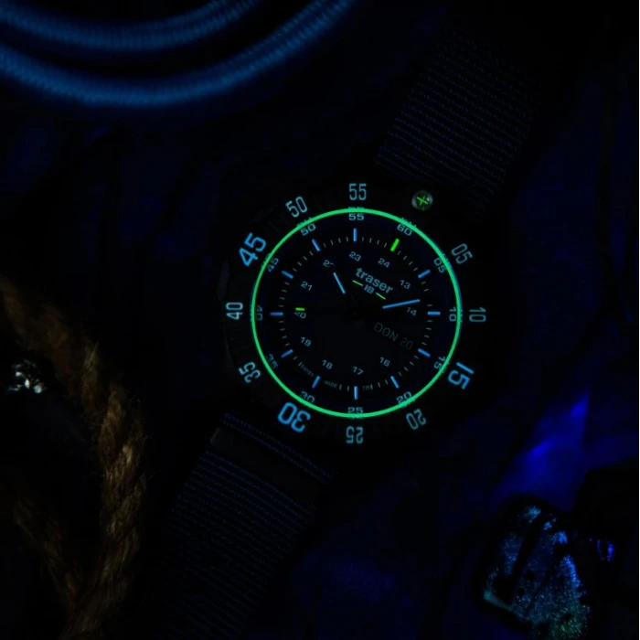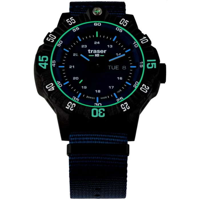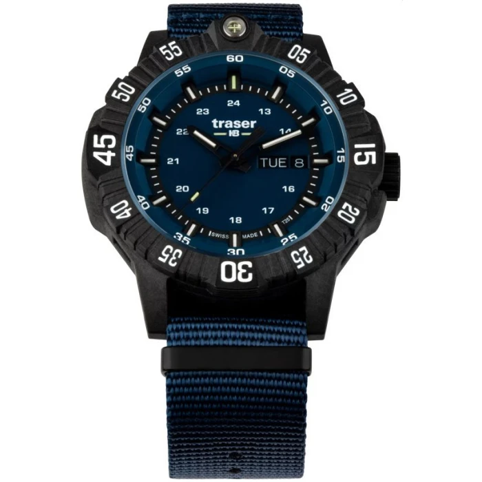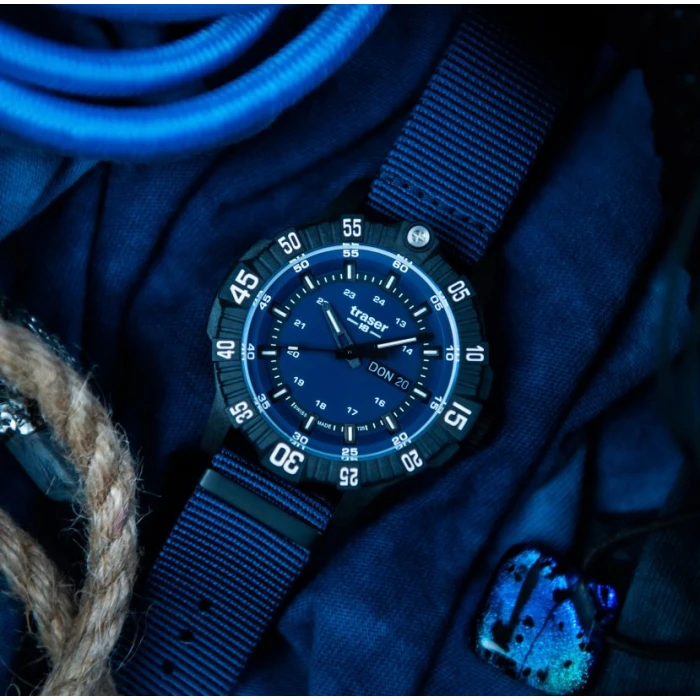 Męski model TRASER TS-110724 na tarczy posiada podwójny datownik wskazujący dzień miesiąca jak i dzień tygodnia - Day-Date. Warto dodać iż rureczki ze świecącym trytem umieszczono na wskazówkach godzinowej i minutowej a także pod indeksami. Bezel można wykorzystać zarówno jako stoper minutowy bądź jako wskaźnik drugiej strefy czasowej. Całość zamyka niebieski, wysokogatunkowy pasek typu Nato o wysokiej odporności na wilgoć.
