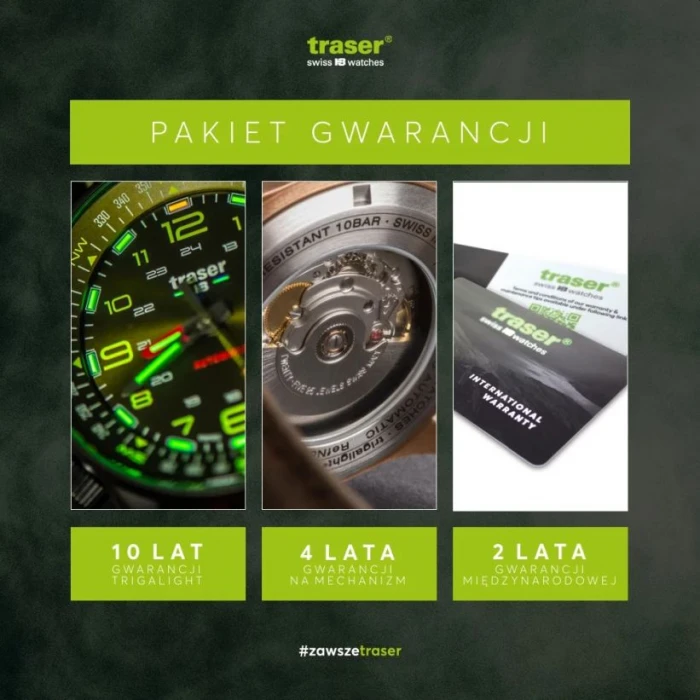 Na życzenie dołączymy torebkę prezentową TRASER. Nasz sklep jest autoryzowanym partnerem marki Traser, zegarki dostępne u nas pochodzą z oficjalnej dystrybucji dzięki czemu kupując u nas masz pewność oryginalności produktu i wsparcie serwisowe producenta w całej Polsce.