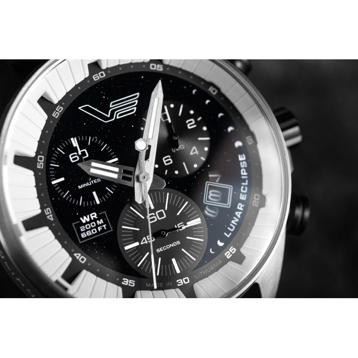 VOSTOK EUROPE 6S30-325E727 to wyjątkowy i przykuwający wzrok model, zainspirowany niezwykłym i efektowym zjawiskiem jakim jest zaćmienie Księżyca. Od setek lat ludzie fascynowali się tym zjawiskiem wznosząc je do rangi omenu dobrego lub złego. Czasomierz napędzany jest za pomocą mechanizmu kwarcowego Citizen Myiota 6S30 Grand Chrono zasilanego baterią. Srebrna koperta została wykonana z hipoalergicznej, odpornej na warunki atmosferyczne oraz korozję, poddanej szczotkowaniu stali szlachetnej. Warto zwrócić uwagę na biały, asymetryczny pierścień wbudowany w kopertę, który symbolizuje zaćmienie. Dopasowano tu czarny pasek z miękkiej skóry naturalnej w eleganckim i ponadczasowym czarnym kolorze. Elementem, który sprawia, że każdy model jest unikalny i jedyny w swoim rodzaju jest ciemna tarcza wykonana z naturalnego awenturynu, który przywodzi na myśl nocne, rozgwieżdżone niebo. Zegarek zabezpiecza utwardzone szkiełko mineralne typu K1, które doskonale chroni przed zarysowaniami czy pęknięciami.