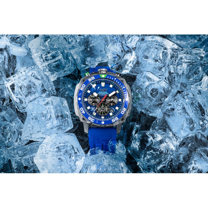 VOSTOK EUROPE VK67-650A720 to wyjątkowy model, którego seria inspirowana jest układem okresowym pierwiastków chemicznych, co z łaciny oznacza Systema Periodicum. Układ okresowy pierwiastków porządkuje wszystkie znane pierwiastki oraz opisuje ich cechy, co czyni go niezwykle przydatnym w świecie nauki. Zegarek poświęcony konkretnemu pierwiastkowi - Wodorowi - wyposażono w japoński mechanizm kwarcowy TMI VK67, zasilany baterią. Beczkowata konstrukcja koperty nieco różni się od standardowych. Przyciski oraz koronkę umieszczono na godzinie dwunastej, co ma swoje zalety, przykładem jest tu szybka i łatwa manipulacja przyciskami chronografu oraz koronką. Wykonana została ze stali szlachetnej 316L w klasycznym, srebrnym kolorze. Całość zawieszono na eleganckim pasku z miękkiej skóry naturalnej, ozdobionej szwami w niebieskiej barwie. Do zestawu dołączono dodatkowy, wymienny pasek, który doskonale sprawdzi się podczas pływania czy innych aktywności. Ciekawym elementem jest tutaj charakterystyczny dla divera, obrotowy bezel ze skalą na wypukłej lunecie. Niebieska tarcza wykończona została szlifem słonecznym, który daje ciekawe i przyciągające wzrok efekty wizualne. Cyferblat zabezpiecza utwardzone szkiełko mineralne typu K1.