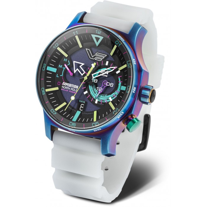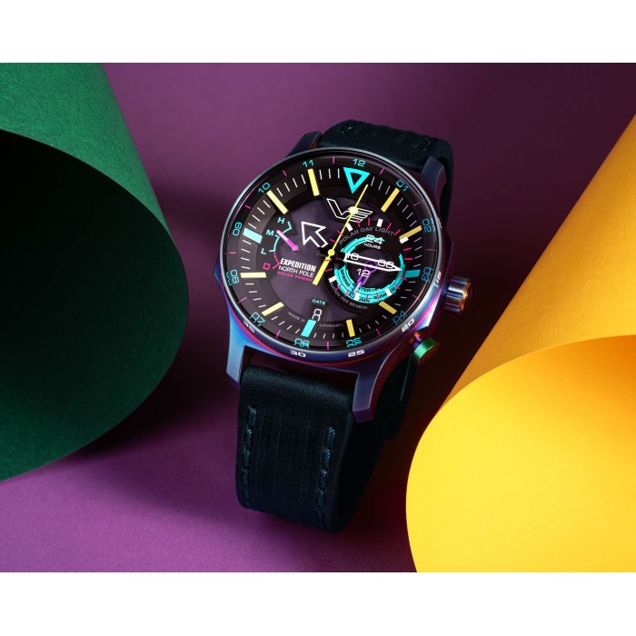 Zegarek VOSTOK EUROPE VS57-595D737 wyposażono w analogowe wskazanie czasu, dzięki temu odczyt jest prosty i intuicyjny. Znaczniki godzin oraz ażurowe wskazówki w pastelowym turkusowym, różowym oraz żółtym kolorze kontrastują na tle ciemnej tarczy, co pozytywnie wpływa na czytelność. Ponad to wypełniono je masą luminescencyjną, co pozwala na odczyt w ciemności. Na cyferblacie znajdziemy wskaźnik naładowania baterii solarnej umieszczony na godzinie dziewiątej. Z kolei na godzinie trzeciej umieszczono subtarcze wskazania pozycji słońca na biegunie północnym w zależności od aktualnej pory roku. Niewielkie okienko datownika przy godzinie szóstej wskaże nam aktualny dzień miesiąca. Na deklu wygrawerowano mapę bieguna północnego, co podkreśla dbałość o detale.