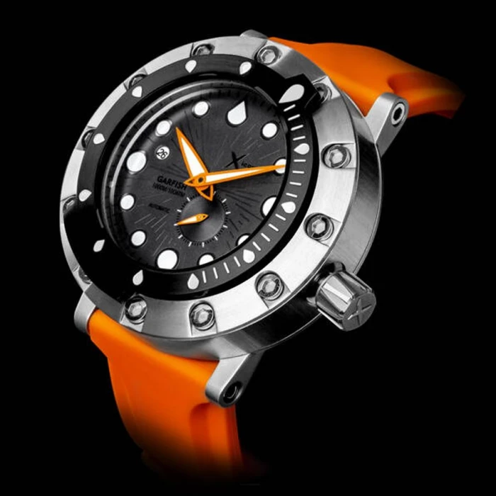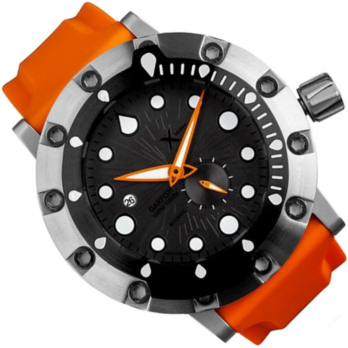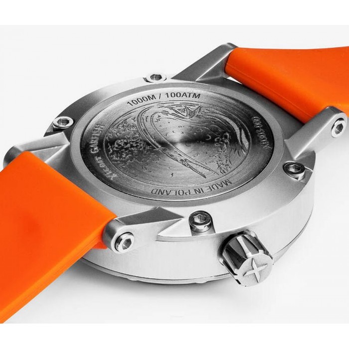 XICORR GARFISH GRor to diver inspirowany sportowym zegarkiem Xicorr Circle, zaprojektowany przez nurków dla nurków. Nazwa czasomierza pochodzi od drapieżnej ryby Bellony (Garfish) występującej w morzu Bałtyckim i Atlantyckim. Wyposażony w zaawansowany mechanizm automatyczny Miyota 8218 osadzony na 21 kamieniach, z częstotliwością 21600 wahnięć na godzinę. Rezerwa chodu wynosi około 40 godzin. Koperta w klasycznym srebrnym kolorze wykonana została z hipoalergicznej, odpornej na zarysowania i korozję stali szlachetnej. Charakterystycznym elementem jest tutaj luneta. Masywna i szeroka do tego ozdobiona dwunastoma imbusowymi śrubkami, co dodaje czasomierzowi dynamicznego wyglądu. Obrotowy pierścień pokryto powłoką DLC, dzięki czemu zyskał czarny kolor. Wypustki na górze i na dole ułatwiają uchwycenie i operowanie bezelem, co zdecydowanie poprawia nurkową funkcjonalność. Ponad to naniesione indeksy co 5 minut, zostały dodatkowo uzupełnione znacznikami minutowymi na długości 20 pierwszych minut. Całość zawieszono na silikonowym pasku w jaskrawo pomarańczowym kolorze. Dzięki dodatkowemu, skórzanemu paskowi czasomierz sprawdzi się również jako nietuzinkowy dodatek na co dzień. Tarcza w czarnej barwie, z dużymi indeksami godzinowymi i wskazówkami w kontrastowej barwie, zabezpieczona została anty refleksyjnym, nierysującym się szkiełkiem szafirowym.