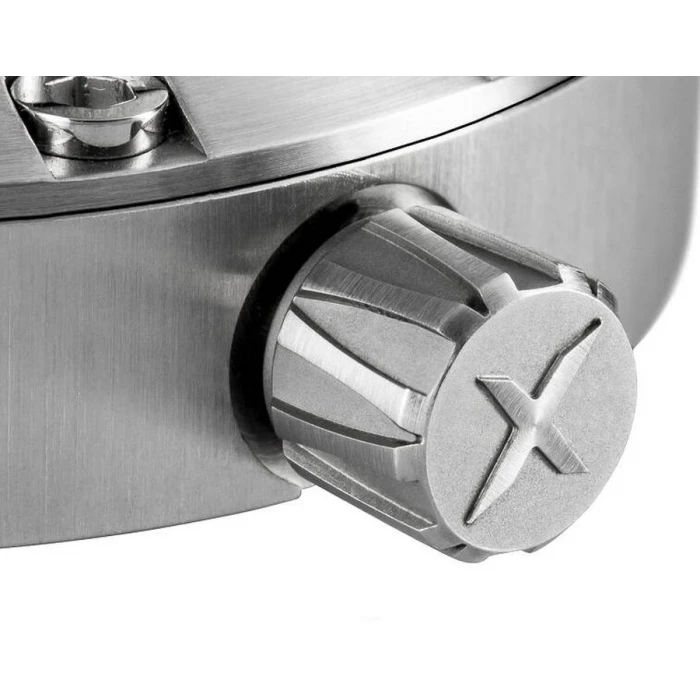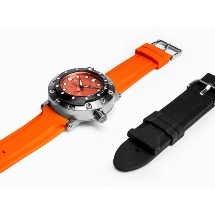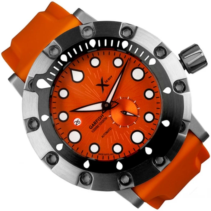 XICORR GARFISH ORbk to model inspirowany sportowym zegarkiem Xicorr Circle, zaprojektowany przez nurków dla nurków. Nazwa czasomierza pochodzi od drapieżnej ryby Bellony (Garfish) występującej w morzu Bałtyckim i Atlantyckim. Wyposażony w zaawansowany mechanizm automatyczny Miyota 8218 osadzony na 21 kamieniach, z częstotliwością 21600 wahnięć na godzinę. Rezerwa chodu wynosi około 40 godzin. Koperta w klasycznym srebrnym kolorze wykonana została z hipoalergicznej, odpornej na zarysowania i korozję stali szlachetnej. Charakterystycznym elementem jest tutaj luneta. Masywna i szeroka do tego ozdobiona imbusowymi śrubkami, co dodaje czasomierzowi dynamicznego wyglądu. Obrotowy pierścień pokryto powłoką DLC, dzięki czemu zyskał czarny kolor. Wypustki na górze i na dole ułatwiają uchwycenie i operowanie bezelem, co zdecydowanie poprawia nurkową funkcjonalność. Ponad to naniesione indeksy co 5 minut, zostały dodatkowo uzupełnione znacznikami minutowymi na długości 20 pierwszych minut. Całość zawieszono na silikonowym pasku w jaskrawo pomarańczowym kolorze. Dzięki dodatkowemu, materiałowemu paskowi czasomierz sprawdzi się również jako dodatek na niecodzienne wyprawy.. Tarcza w pomarańczowej barwie, z wyraźnie zaznaczonymi indeksami godzinowymi i wskazówkami w kontrastowej barwie, zabezpieczona została anty refleksyjnym, nierysującym się szkiełkiem szafirowym.