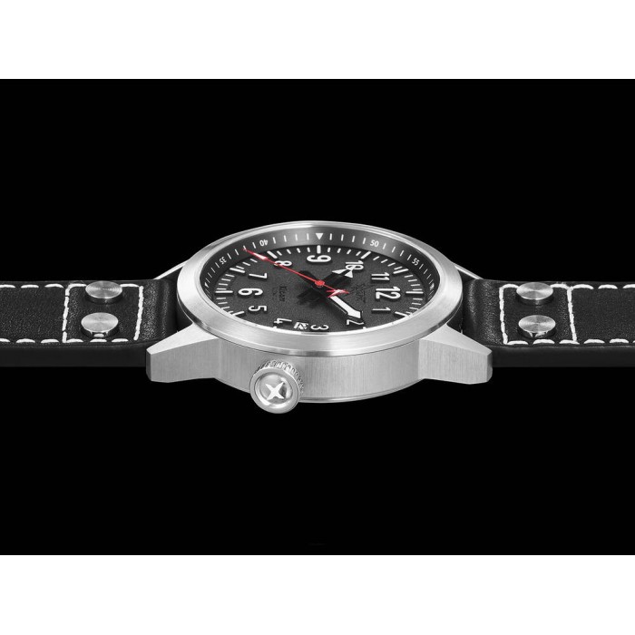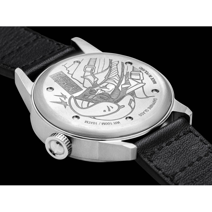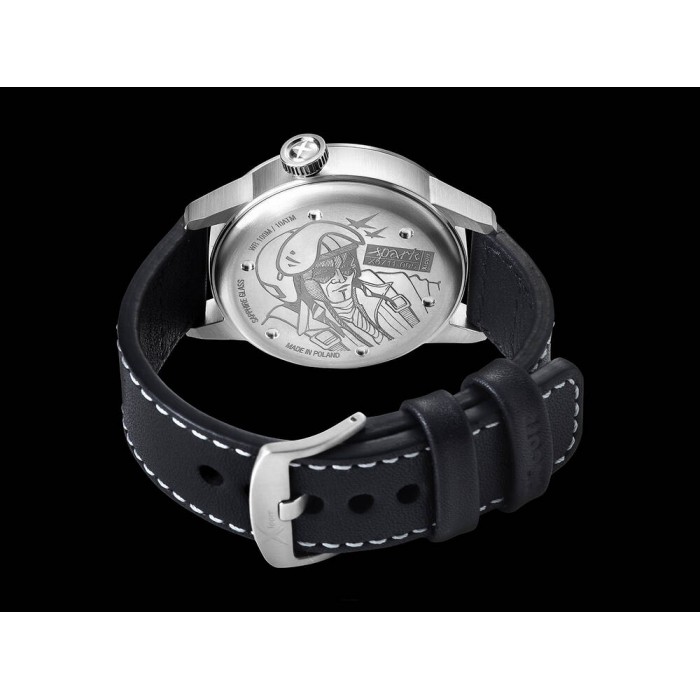 Uwagę zwraca klasyczna forma okrągłej koperty i układ koronki na wysokości godz. 15:30 co jest charakterystyczne w zegarkach tego polskiego producenta. Na tej samej wysokości znajdziemy okienko datownika wskazującego aktualny dzień miesiąca. Stylistyka tarczy o chropowatej powierzchni przypomina taflę lotnika na której osadzono wyraźne indeksy i cyfry poryte grubą warstwą lumy świecącą w ciemnościach.