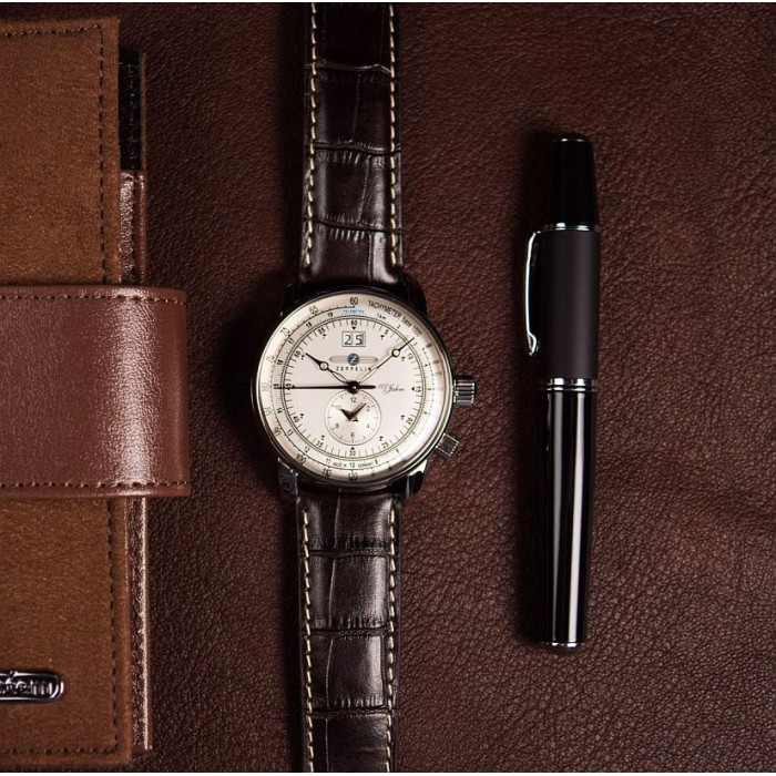 Zegarek męski Zeppelin 76401 100 Jahre - napędzany jest za pomocą mechanizmu kwarcowego Ronda 6203B napędzanego baterią. Z pietyzmem i niemiecką starannością wykonano srebrną tarczę, którą chroni cylindryczne, odporne na stłuczenia szkiełko mineralne. Stalowa koperta utrzymana jest na eleganckim, brązowym pasku ze skóry naturalnej przeszywanej beżowymi nićmi. Przy godzinie 12 znajduje się datownik z podwójnym okienkiem pokazujący aktualny dzień miesiąca. Z kolei nad godziną 6 umiejscowiona została tarcza pełniąca funkcję drugiego czasu. Wodoszczelność na poziomie 5ATM (50m) pozwala na chwilowy kontakt z wodą . Dodatkową funkcją czasomierza jest skala tachometru naniesiona wzdłuż lunety czasomierza. Retro model przypominający lata 20te i 30te XX wieku związane z niemieckimi sterowcami.
