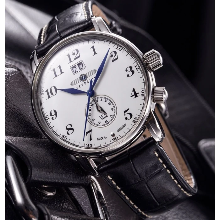 Zegarek męski Zeppelin LZ127 Dual Time 7644-1 napędzany jest za pomocą mechanizmu kwarcowego Ronda 6203.B. Biała tarcza z wyraźnymi cyframi, przykryta jest, odpornym na stłuczenia, mineralnym szkiełkiem. Stalowa koperta utrzymana jest na skórzanym, czarnym pasku przeszywanym białą nitką. Przy godzinie 12 znajduje się datownik wskazujący aktualny dzień miesiąca. Z kolei nad godziną 6 umiejscowiona została tarcza pełniąca funkcję dual time. Wodoszczelność na poziomie 5 ATM (50m) sprawia, że z czasomierzem można brać kąpiel, ale nie zaleca się z nim pływać.