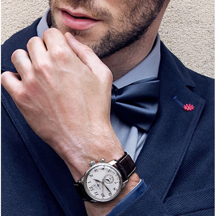 Zegarek męski Zeppelin LZ127 Dual Time 7644-5 napędzany jest za pomocą mechanizmu kwarcowego Ronda 6203.B. Beżowa tarcza przykryta jest, odpornym na stłuczenia, mineralnym szkiełkiem. Stalowa koperta utrzymana jest na skórzanym, brązowym pasku. Przy godzinie 12 znajduje się datownik pokazujący aktualny dzień miesiąca. Z kolei nad godziną 6 umiejscowiona została tarcza pełniąca funkcję dual time. Wodoszczelność na poziomie 5 ATM (50m) to odporność na zachlapania i krótkotrwałe zanurzenie w wodzie.