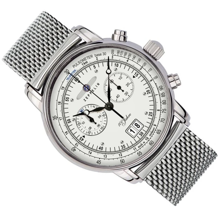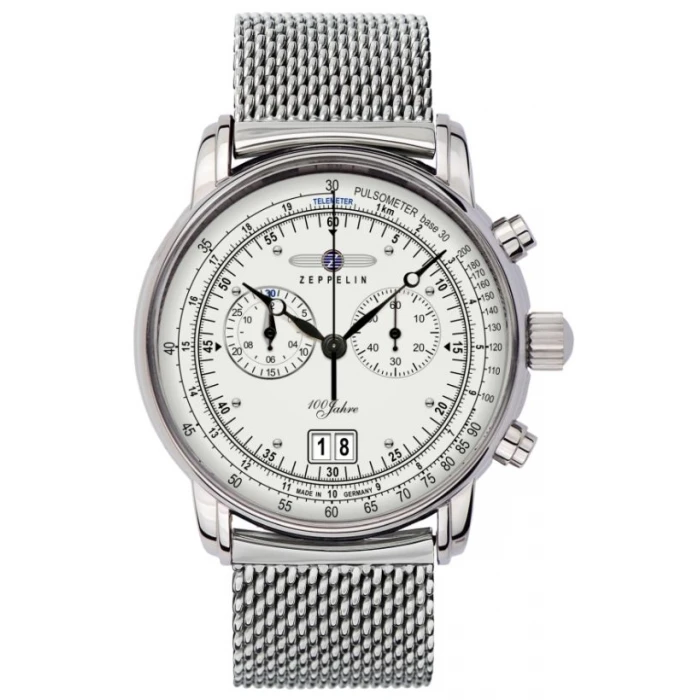 Zegarek ZEPPELIN 7690M-1 100 Jahre to jeden z najchętniej wybieranych modeli z tej kolekcji. Została ona stworzona na 100-lecie powstania tej niemieckiej marki. Czasomierz łączy w sobie wszystkie najważniejsze cechy, jakie powinien posiadać idealny zegarek - doskonałe parametry techniczne oraz dopracowany design. Szczególną uwagę przyciąga biała tarcza na której znajduje się datownik. Przed uszkodzeniami zabezpiecza ją wysokiej jakości szkiełko mineralne, które w razie potrzeby można polerować. Wokół niej umieszczono kopertę ze stali szlachetnej. Całość uzupełnia bransoleta z wygodnym zapięciem. Zegarek ZEPPELIN 7690M-1 100 Jahre ma wodoszczelność na poziomie 5 ATM dzięki temu nie musimy martwić się o jego zachlapanie podczas mycia lub dezynfekcji rąk. Działa w oparciu o bezawaryjny mechanizm kwarcowy Ronda 5020.B.